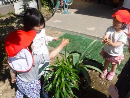 今日その前を通りかかった3歳児もも組の子どもたちは
