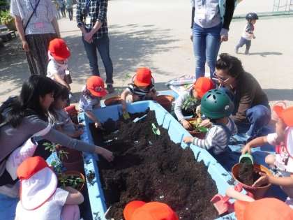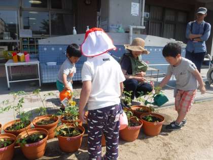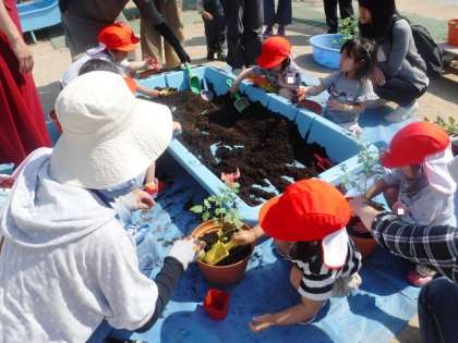 3歳児もも組は,親子でミニトマトの苗を植えました。