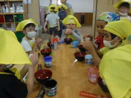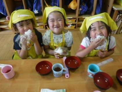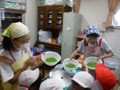 ほかほかの豆ごはんを自分で握って食べると,味は格別だったことでしょう。