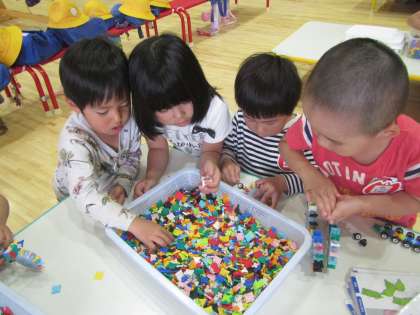 なかよしタイムでは,担当の先生がいろいろな遊びの環境を用意しています。また,3歳児から5歳児まで一緒に過ごすので,自然と異年齢でのかかわりも生まれ,小さな友達を思いやる姿や,5歳児の遊びにあこがれ“やってみよう”と真似る4歳児や3歳児の姿もあります。