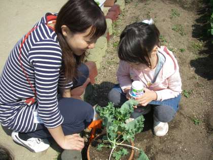 大事に保育室に入れようと葉ボタンを植木鉢に入れ替えようとしていた時のことです。