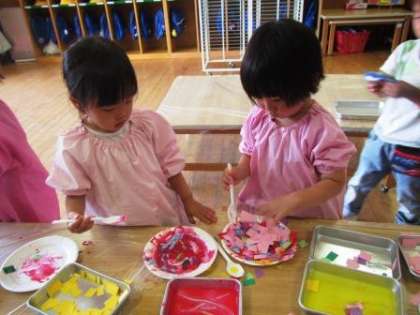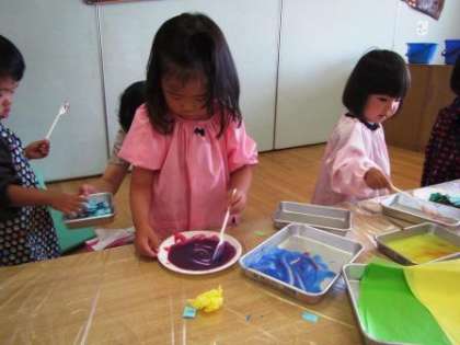 切った紙を野菜や果物に見立てて混ぜる子ども,ソースだけを色が変わるまで混ぜる子ども,色々なことを楽しんでいました。
