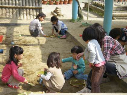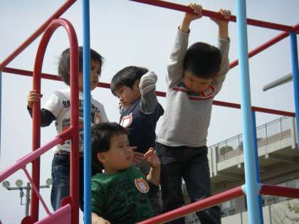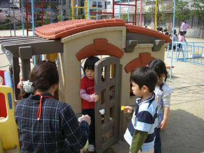 3歳児の子どもたちも,少しずつ行動範囲が広がってきました。砂場やジャングルジムなどで,先生やその場で一緒になった人と遊ぶこともできるようになってきました。