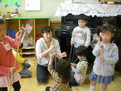 保育室を除いてみると先生と一緒にそして先に出来上がった子どもたちも子ども先生になって,みんなで風車を作っていました。