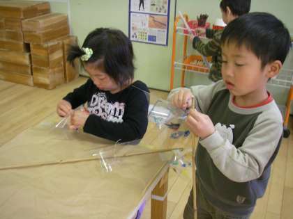 爽やかな風を受けてきっとよく回る風車ができることでしょう。ちょっと難しいけれど年長組になったからこそ自分たちで「やった!」と感じられる初めての作品といってもいいでしょう。