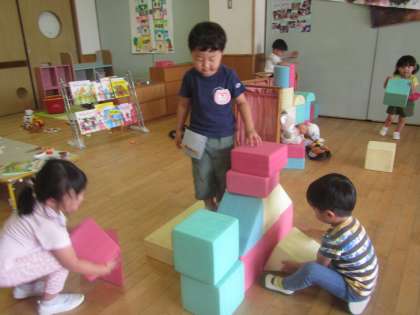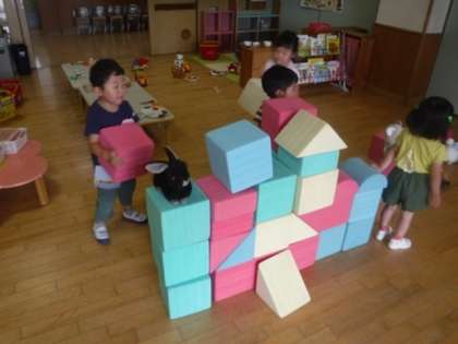 電車になったり,家になったり,お城になったり,ジャンプ台になったりと,その日のイメージで,積み木遊びを楽しんでいます。