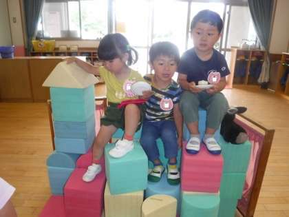 出来上がるとやっぱり登りたい!!一人が上ると「ぼくも」「私も」と登りはじめました。パーティをしようとケーキを食べたりごちそうを運んだりしていました。
