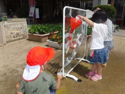 色水を入れると透明ホースの中をグルグル色水が流れていきます。入れた色水がどこにいくのか上から覗いたり流れていく様子を目で追ったりして,水の動きを見ています。ホースの先から出てくると「うわ〜!」と喜び,繰り返し楽しんでいました。