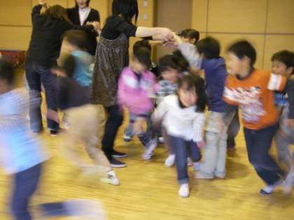 子どもたちや離任された元みつば幼稚園の教職員の方々や現みつば幼稚園教職員の近況報告や紹介などをした後,みんなで「あの橋が落ちる前に」をして遊びました。ここでもパワー全開で走ること走ること・・・。