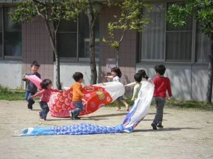 「ねえ,おさかながお庭を走ってる!!!」と大興奮で知らせに来てくれた3歳児のBちゃんです。「え〜おさかな?どこどこ?」指差す方を見ると大きな赤いさかなが広場を走って(飛んで)いました。
