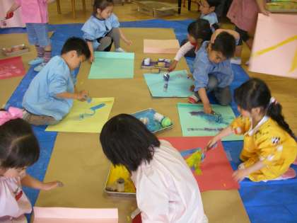 久しぶりの絵の具遊びです。「見て〜こんな色になった」「私のも〜」「僕のも〜」。