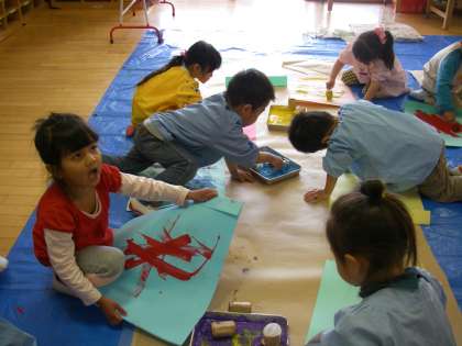 いろいろな色を使ったり,手やローラーなどを使って遊んだり,型おしをしたりとそれぞれ自分たちが満足するまで遊んでいました。