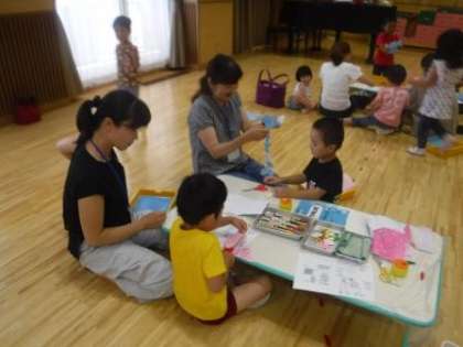 今日は遊戯室でばら組が七夕の親子製作を行いました。はさみで切り込みを入れる,と言葉だけ聞いても,子どもだけではなかなかうまくいきません。しかし,今日はおうちの人に線を書いてもらい,紙を持ってもらうことで,線のところだけ切ってみようと頑張っている姿がありました。親子で飾りに使う色紙を選ぶなど,一緒につくることに嬉しさを感じる様子もありました。