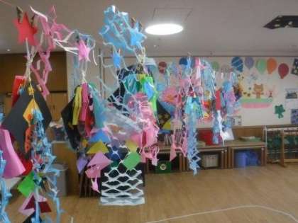 できた飾りは保育室にある個人の星に飾ってもらいました。弁当の時や降園前に集まる時には,ついつい上を見上げて自分の飾りを探したり,風で揺れている飾りを見つめたりしていました。みんなの願い事が空のお星様まで届きますように…