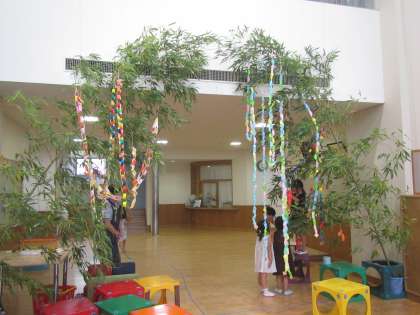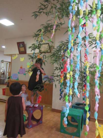 今朝,みつば幼稚園に笹が届きました!2本の大きな笹。玄関に飾ると素敵な笹のアーチになりました。「わあ,竹藪の中にいるみたい!」いろいろな学年の子どもたちがやってきて笹に飾りをつけています。日に日に飾りが増えていくことでしょう。外は雨ですが,幼稚園は七夕の雰囲気でいっぱいです。