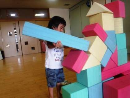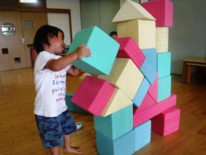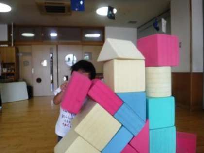 ピンクの平たい積み木が,斜めの場所にも乗ることを発見したAくん。(写真1)