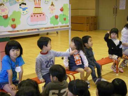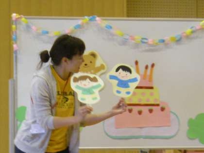 みんなが集まったところへくま君が現れました。今日はくま君の誕生日です・・・というくま君のペープサートが始まり,みんなはくま君に惹きつけられて一生懸命みていました。大きな真っ白のお皿には,おいしそうな大きなケーキが。ローソクは4本立てられました。お祝いに集まってきたのが,4月生まれのお友達です。と誕生児が次々と順番に紹介されました。