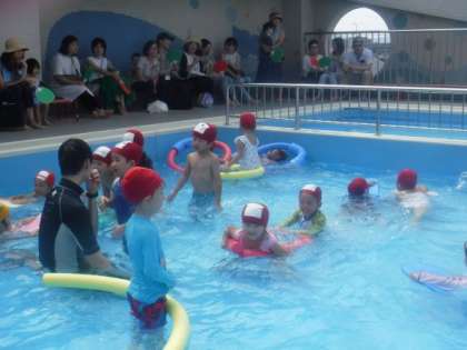 5歳児は,浮輪を使って浮力を感じたり,顔を水につけてスーッと体を伸ばしたりして遊びを楽しんでいます。水泳大会ごっこの時は,友達を応援する声が響きます。