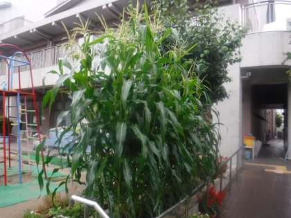 春にゆり組の子どもたちがまいたポップコーンの種が,この3か月ほどでこんなに大きくなりました。大人の背丈くらいあります。そして,土曜日・日曜日を経て花が咲いてきましたよ!
