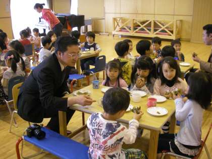鼓月様のお二人にも子どもたちと一緒に食べていただきました。