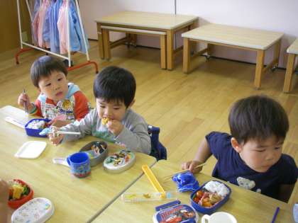 連休と連休の間の今日5月6日,3歳児は初めて幼稚園でお弁当を食べました。