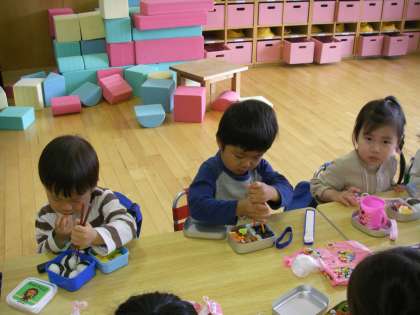 もう待ちきれなくなった頃,片づけの時間となり,いよいよお弁当です。