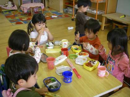 食べた後も,片づけてかばんに入れることをしなくてはなりません。横で遊び始めた人がいると気になって遊びたくなるのですが,「○○ちゃんのお弁当箱,迷子さんでエ〜ンエ〜ンって泣いているよ」というとニコッと笑ってお弁当箱を片づけ,「もう泣いてはらへん」とそ〜っと報告に来てくれた人もいました。