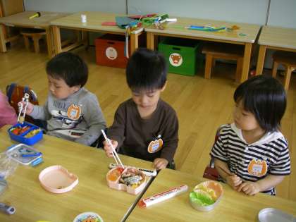 家ではどうされているのでしょうか。今日,一生懸命お箸と格闘している人もいました。お箸をもちながら,手づかみになりそうな人もいましたが,それでも何とかお箸を使おうとする様子や,「つかめない」と言っていたのにうまくお箸に引っかかってくれたので嬉しくなって全部食べることができたりもしていました。