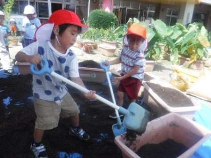 今日のなかよしタイムでは,お昼ご飯を食べた後,園庭のプランターの土に新しく腐葉土や,キラキラの土(バーミキュライト)などを加え,栄養のある土をつくりました。