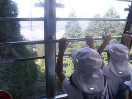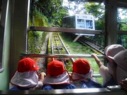 今日は,4,5歳児が遠足で比叡山に出かけました。バスや叡山電車,ケーブルカーやロープウェー,様々な乗り物に乗ることができると楽しみにしていました。特に,ケーブルカーやロープウェーは,山を登っていく乗り物ということで,発車を知らせるブザーが鳴ると,どうやって動くのかなと興味津々でした。少し揺れて動き始めると,「おお」「動いた」と喜ぶ姿がありました。