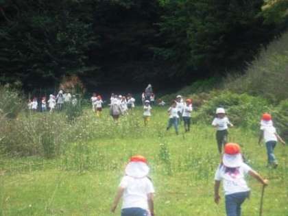 芝生の坂道を一番上まで登ってみよう!大きなバッタはいるかな?など,幼稚園では出会えない自然と触れ合うひと時を楽しみました。