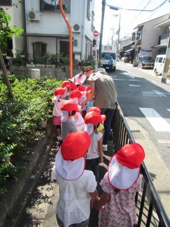 3歳児もも組は,今日は幼稚園の周りをぐるりと散歩に出かけました。