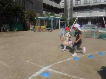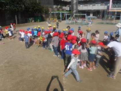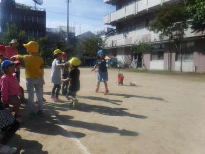 運動会が終わっても,みんなで体を動かして遊んでいます。今日はもも組・ばら組・ゆり組合同で3チームに分かれてリレーをしました。初めて走るもも組の子どもには,ゆり組の子どもが手をつないで一緒に走る姿もありました。