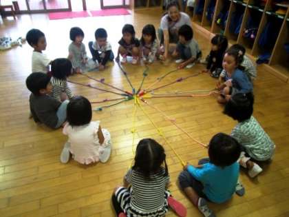 3歳児は,なわを持っていないので,安全に使えるなわ代わりのものを一緒につくり,使っています。