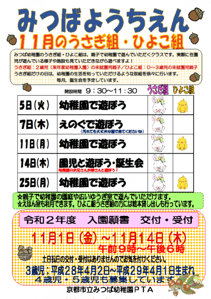11月1日(金)から11月14日(木)までの期間,令和2年度入園の願書交付・受付を行います。