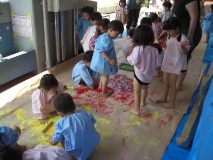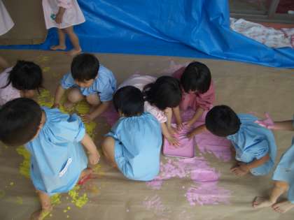 3歳児の子どもたちにとって初めての絵の具あそびです。