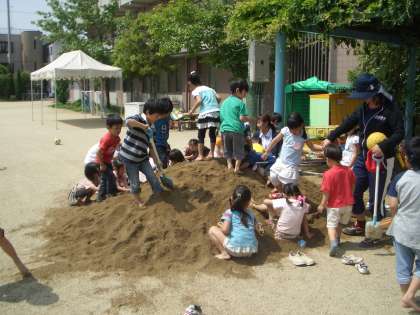 今度のトラックは幼稚園のお庭に砂山を作っていきました。