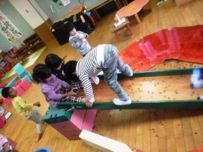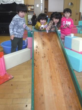 ころころころころ〜と転がっていく音や様子が面白く,最後は自分たちもすべり台をころころころころ〜と転がります。