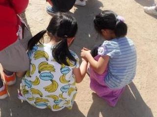 「帽子取り,怖いから見てる…」というばら組に,「いいよ,ここで一緒に応援しよう」と手をつないで一緒に見ていてくれるゆり組さん(写真2)