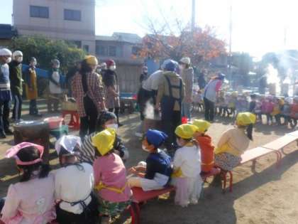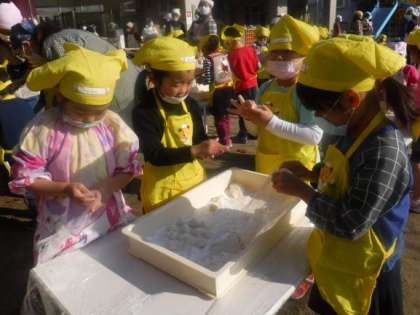 みつば幼稚園では毎年地域の皆さん,PTAの皆さんにご協力いただき,もちつきを行っています。早朝よりご協力いただいた皆様,本当にありがとうございました。おかげで子どもたちはもちをつく・丸めるという直接体験や,直火の勢いや温かさ,湯気がたちのぼるあわただしい雰囲気などを味わうことができました。ありがとうございました。