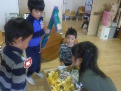 すると,保育室にある黄色い紙でつくった焼き芋を入れるAちゃん。「いももちにするねん。」と話していました。(2日前に読んだ絵本で,色々な種類のもちがあるということを思い出していたのかもしれません)それを聞いたBちゃんは,「じゃあおいももっと入れよう。」と提案し,いももちつくりが始まりました。おもちも焼き芋もたくさんついて,とても美味しそうないももちが出来上がりました。実際に経験したことや絵本で見たことなど,色々な経験が子ども達の遊びの中にも活かされています。
