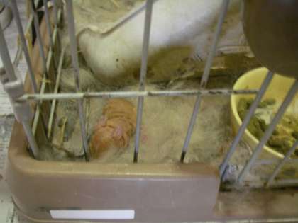 1ヶ月前にも同じように毛をいっぱい抜いていたので,ひょっとして・・と職員室に入れて様子をみていたのですが,その時は違ったので,今回もどうかなと思いながら遠足にいったのですが,やはり気になったので,帰る早々ご機嫌伺に行ったところ,2羽の赤ちゃんが生まれていました。