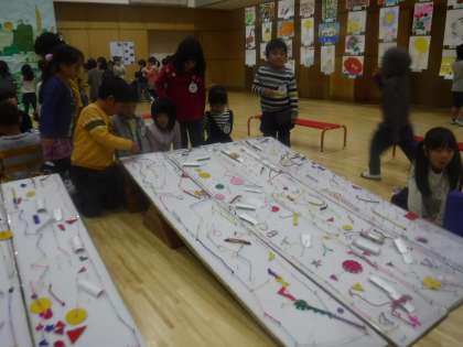 子どもたちの思いがつまった作品や,遊んで楽しんだ跡を展示しています。