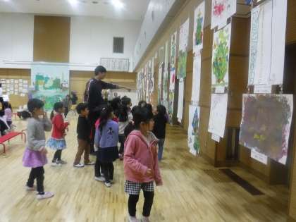 今日は子どもたちも先生と一緒に園内展を見学しました。「あ,(自分の)あった!」「これいいなあ」と自分や友達の作品を興味をもって見ていました。