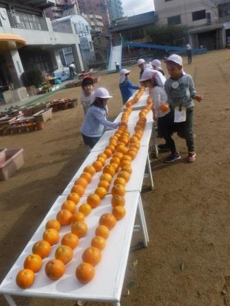 昨日,枝についているみかんを子どもと一緒に何度も数えると,104個あるらしいことが分かりました。幼稚園の子どもと大人の数を一生懸命数えたり聞いたりして,みんな1個ずつ持って帰れるはずだと大喜びでした。