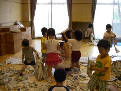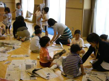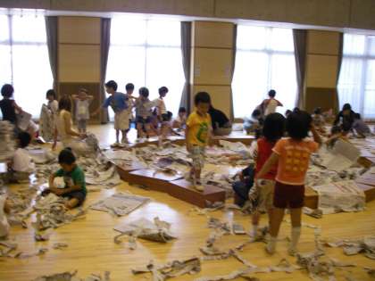 6月19日の預かり保育に,みつばの森のメンバーがかかわって今回は「新聞遊び」をしました。遊戯室いっぱいに新聞を広げ,ちぎったり,かけあいっこをしたりして思いっきり楽しみました。