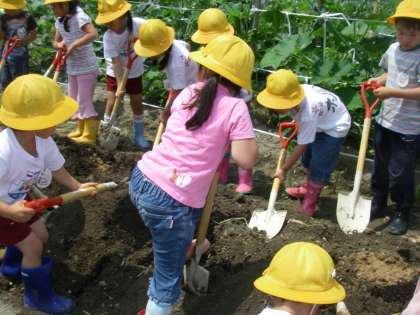 ゆり組はタマネギを収穫したあとの畑にサツマイモを植えようとしているので,収穫のあと,みんなでスコップを使って,土の手入れをしました。たくさんのお友達が力を合わせて掘ってくれたので,早いこと肥料もいれ,よい畝ができました。そこにサツマイモの苗を植えました。暑いけれど頑張って育っていってほしいと思います。
