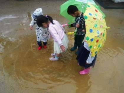 長靴で水たまりに入っていくと