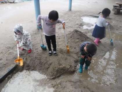 たくさん水がたまっている砂場でも,水の流れを感じて遊びました。