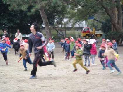 広いグラウンドで,かくれんんぼをしたり,ボール運びリレーをしたり,しっぽとりをしたりして遊びました。